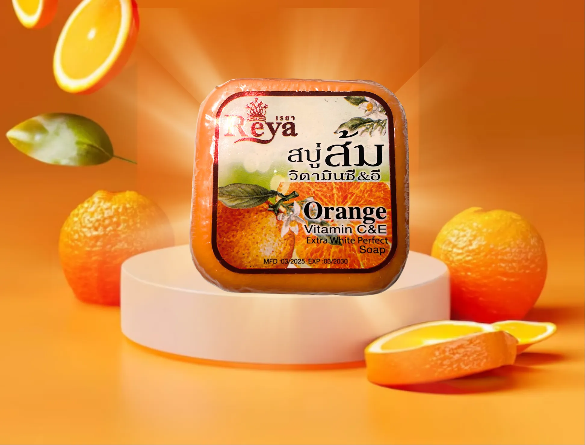 Thông tin sản phẩm: Xà phòng Reya Cam & Vitamin C, E (Orange Vitamin C & E Soap) được chiết xuất từ tinh chất cam và các loại Vitamin. Sản phẩm có công dụng làm sạch sâu, cung cấp dưỡng chất và chất chống oxy hóa, giúp da sáng mịn, khỏe khoắn và rạng rỡ hơn.