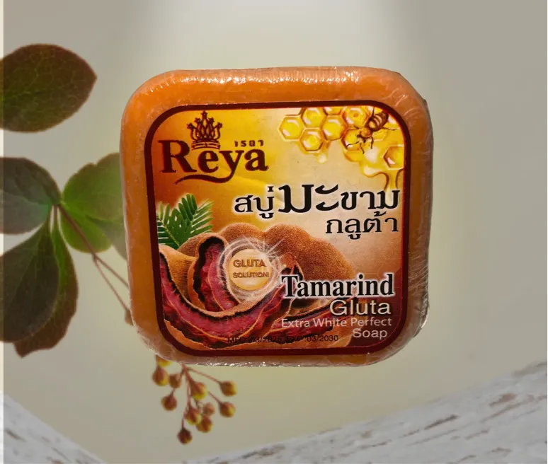 Thông tin sản phẩm: Xà phòng Reya Me & Gluta (Tamarind Gluta Soap) với chiết xuất từ me tươi và Glutathione. Sản phẩm giúp làm sạch sâu, tẩy tế bào chết nhẹ nhàng, hỗ trợ làm da sáng và mịn màng tự nhiên, mang lại cảm giác dễ chịu.